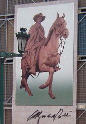 A estas citas propias de locus amoenus sanisidrino le acompañan imágenes del Country Club, la avenida Arequipa de los años treinta, rejas, balcones, fuentes y dos importantes personajes, San Isidro Labrador y el presidente Leguía jugando golf. Efectivamente, estas imágenes y frases hablan del pasado de los sanisidrinos, pero no creemos que sea el pasado de todos los trabajadores que están obligados a ver los carteles por largos minutos mientras el autobús, atestado de gente, espera la luz roja. Sin embargo, y por más que esto solo haya significado un pequeño sinsabor, las imágenes se quedan ahí, imperturbables e inamovibles. San Isidro le hace propaganda al distrito, pero también recupera un pasado que no podría ni puede ser compartido por todos. ¿Cómo reconocerse a través de las imágenes de mujeres de largos apellidos o cariñosos apodos como Mona Jiménez, Isabel Larco o Ana María Álvarez Calderón de Olaechea? ¿Quiénes son Natalia Málaga, Cecilia Barraza, Rosa María Palacios, Lourdes Flores Nano, todas mujeres que aparecen como “vecinas de San Isidro”? Y en la foto de las casas sanisidrinas nadie es el dueño, como también ninguno ha paseado por El Olivar. Frente a este espectáculo (los autos pasan rápidamente) se encuentra un cartel que dice “San Isidro, comunidad de artistas” y hay cinco reproducciones gigantes de pinturas. Una de ellas es del pintor Fernando de Szyszlo y la otra la silueta de un caballo de paso, las artes plásticas también divulgan el estupefaciente (3). Dice el alcalde: “Más allá de su liderazgo distrital y su aristocrática belleza, San Isidro aporta al país intelectuales, empresarios, académicos y políticos de nota; pero sobre todo, es cuna de connotados pintores y escultores que nos prestigian tanto nacional como internacionalmente”. Se celebra la existencia de pintores y escultores, pero también se da a entender que el “liderazgo” y la “aristocrática belleza” son naturales al distrito. _________________________