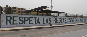 Al llegar a la avenida La Molina por la avenida Javier Prado, esto es, la segunda entrada vial más importante del distrito de La Molina , encontramos pintado en las paredes las siguientes frases: “Respeta las reglas, estás en La Molina”; “No ensucies las calles, estás en La Molina”; “No contamines, estás en La Molina”. Entendemos que frases como estas forman parte de todo acervo municipal (aunque muchas veces sin poner los basureros suficientes para poder cumplirlas), pero también encontramos un elemento que extraña el mensaje (1). ¿Qué significa “estar en La Molina”? ¿Que sólo allí se deben cumplir las reglas? ¿Que sólo allí no se deben ensuciar las calles o que estoy obligado a hacerlo porque ahora “estoy en La Molina ”? Aunque el propósito del mensaje se entiende —no contaminar, no ensuciar las calles— hay un aire a punición. Una voz que busca enseñar un poco de cultura urbana, pero que también castigará en caso de desobediencia. Pero el mensaje ni siquiera está dirigido al habitante de La Molina sino al que visita este distrito. El ciudadano que llega a La Molina tiene que obedecer las reglas (a riesgo de ser castigado), pero no porque estas sean reglas de urbanidad en sí sino simplemente porque se está en La Molina. La persona que llega a La Molina en vez de ser bienvenida es amenazada.